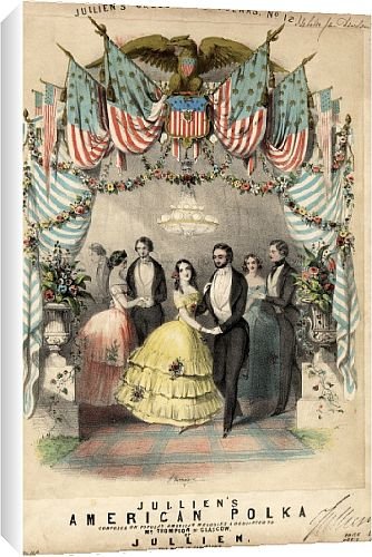 - Image Description: Music cover for Julliens American Polka (part of Louis Antoine Julliens Celebrated Polkas series), based on popular American melodies and dedicated to Mr Thompson of Glasgow. Three elegant couples are depicted, dancing at a ball. At the top is an arrangement of American flags, with an eagle above.